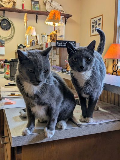 Arthur and Felix are brothers that work hard to defend the barn from pests, greet clients, and compete for attention. Although they look very similar, Arthur has a small white dot on his head. We've had several talks with them about napping on the job, but they insist it's vital for their work performance.